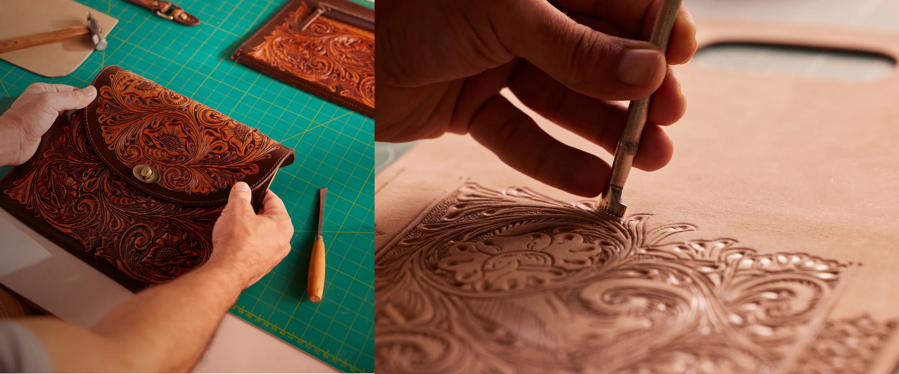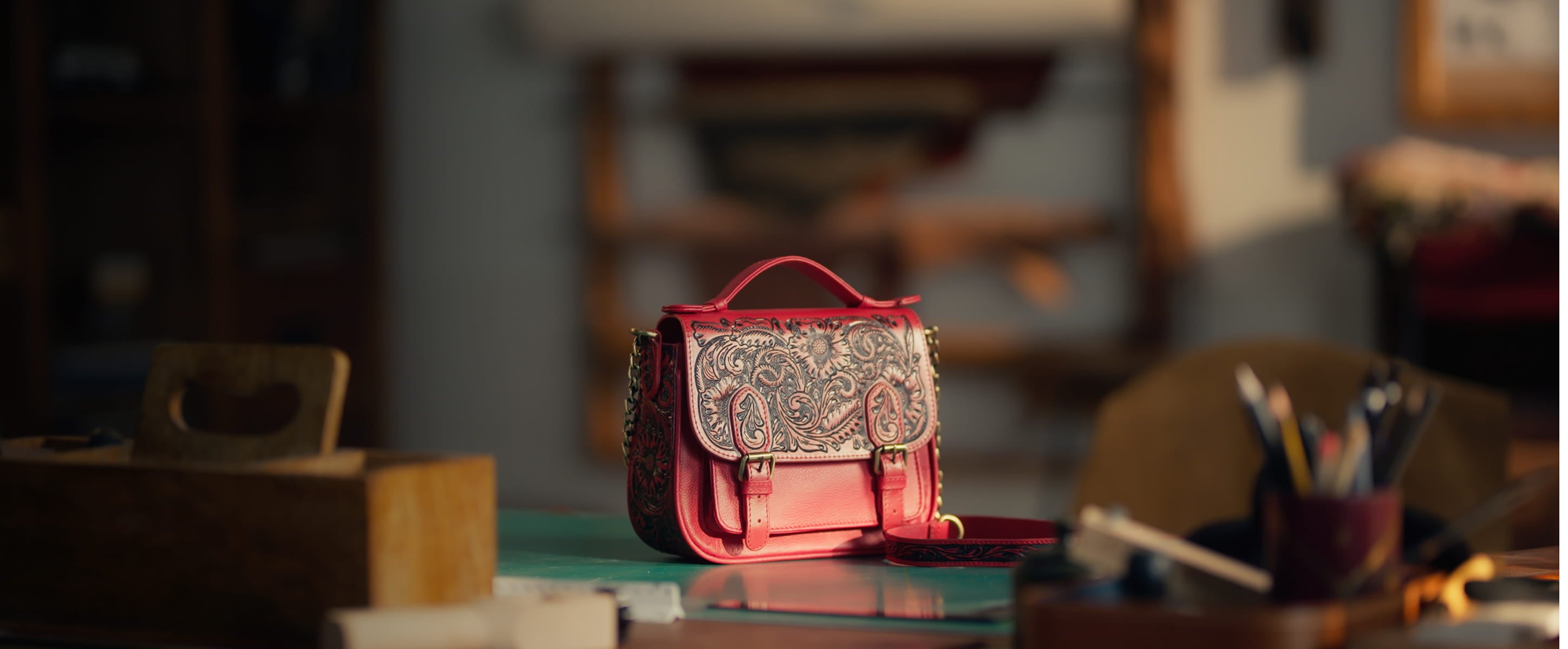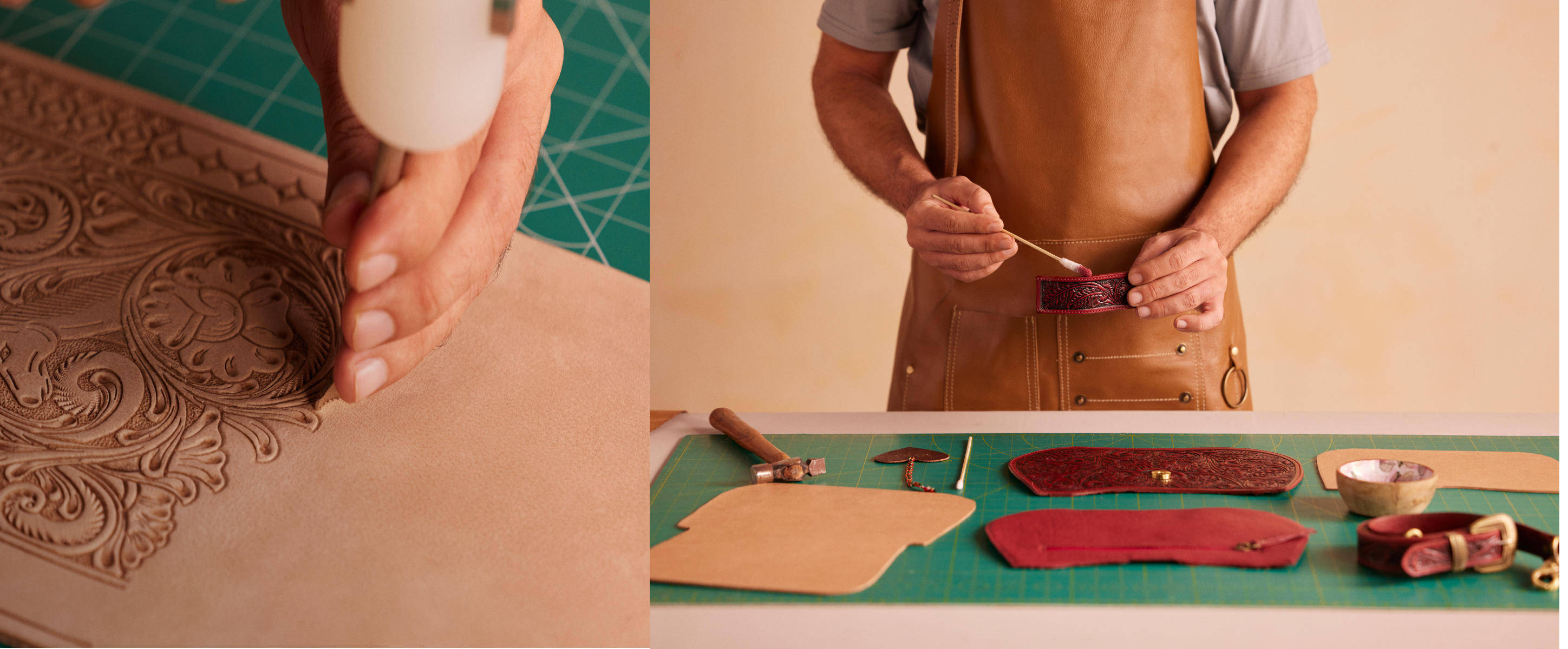 ATELIER WEST BEGINS AT THE MAKER'S TABLE. TRUE TO THE ATELIER SPIRIT, IT REFLECTS INTRICATE TOOLING, DETAILED CRAFTSMANSHIP AND PRECISION. THE ATELIER STORY COMPLETES WITH ZIDANA: A SUSTAINABLE VEG-TANNED LEATHER HONOURING THE LAND AND CARVED AS MODERN KEEPSAKES.