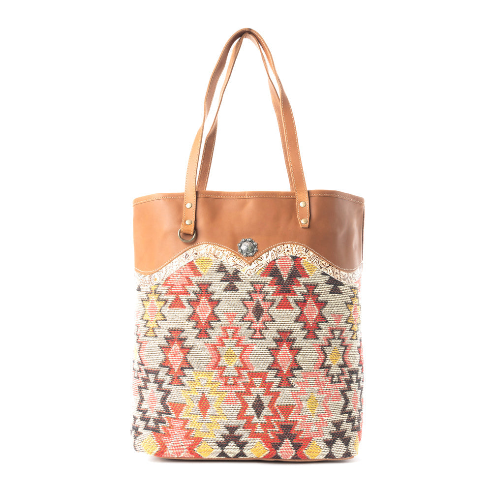 From our Desert Bloom collection comes this wonderful tote bag. It features a stunning front of a beautiful upcycled woven rug, with a top panel in rich caramel leather and cream leather tooled accent. The back panel is a matching woven canvas with a zippered pocket. Zipper-close top and sturdy leather carrying straps complete this spacious bag.,