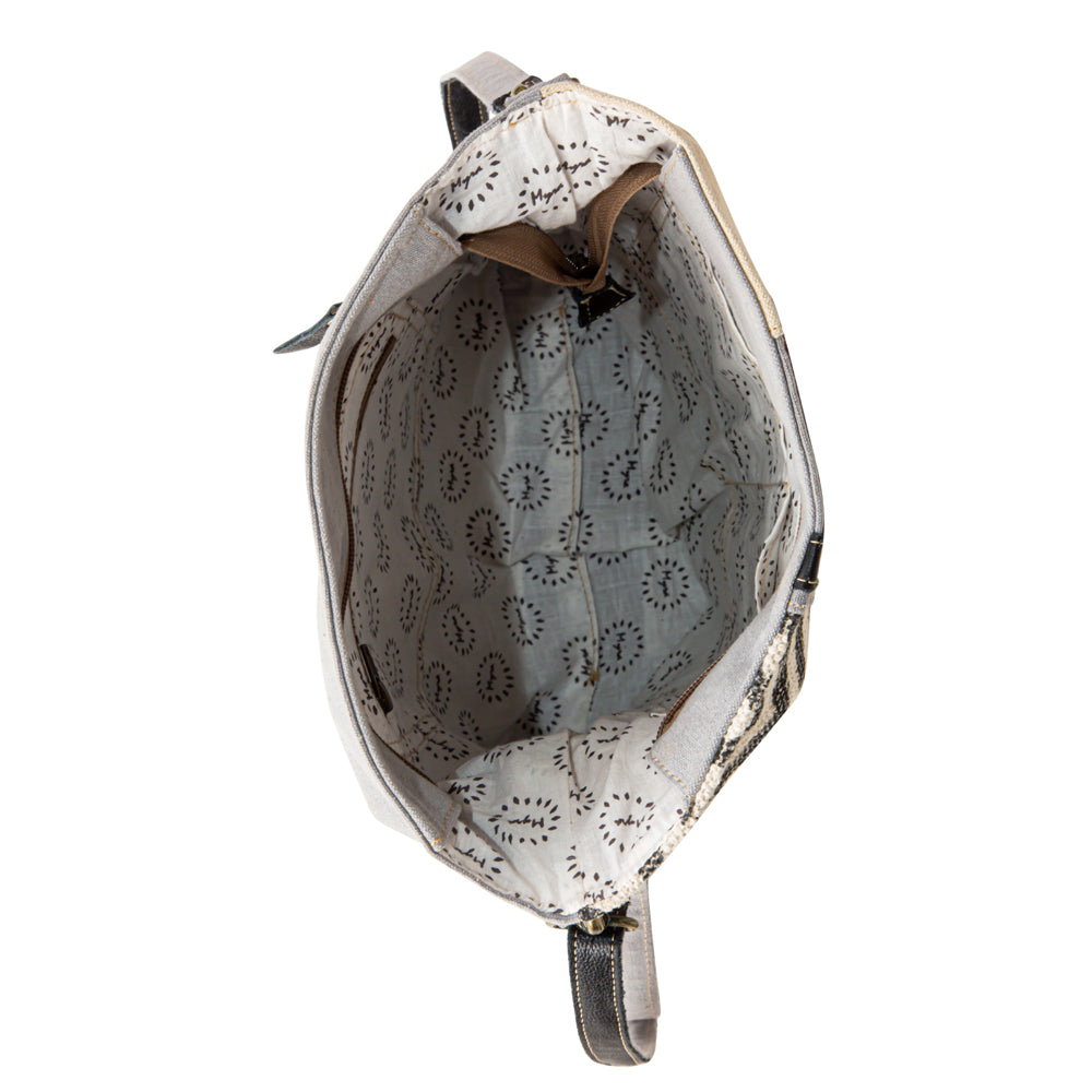 This beautiful bag features a wonderfully textured design with sewn accents, fanciful worded patch, and leather and metal accents. Zipper-close top, dove gray canvas back with zippered pocket, and black leather adjustable, removable shoulder strap.