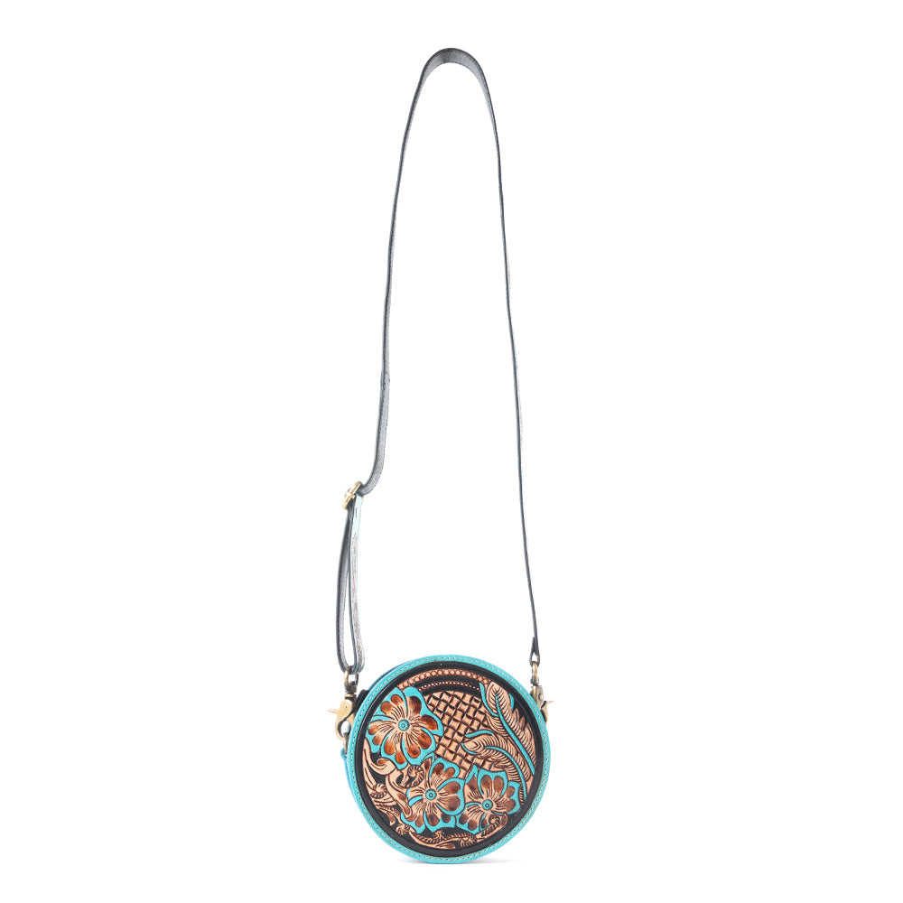 This round bag is simply sublime, with a front of beautiful hand-tooled leather with remarkable turquoise accents. The back is a striking high-grain leather in vibrant turquoise, complete with a zippered pocket. The shoulder strap is also detailed in the continuing hand-tooled theme. Simply remarkable, this bag is sure to be a show-stopper and a favorite in your collection.