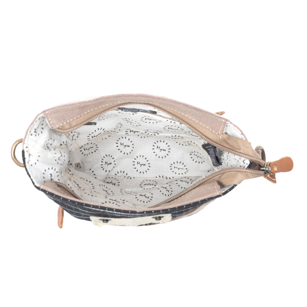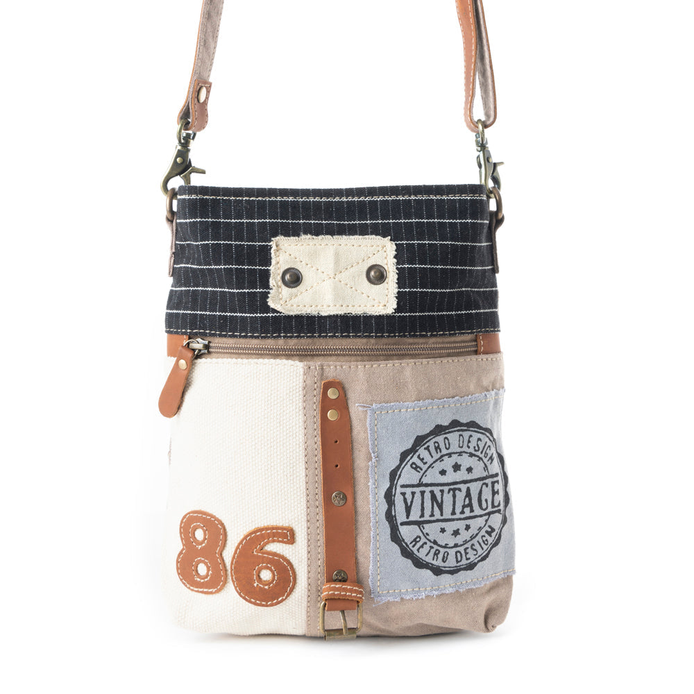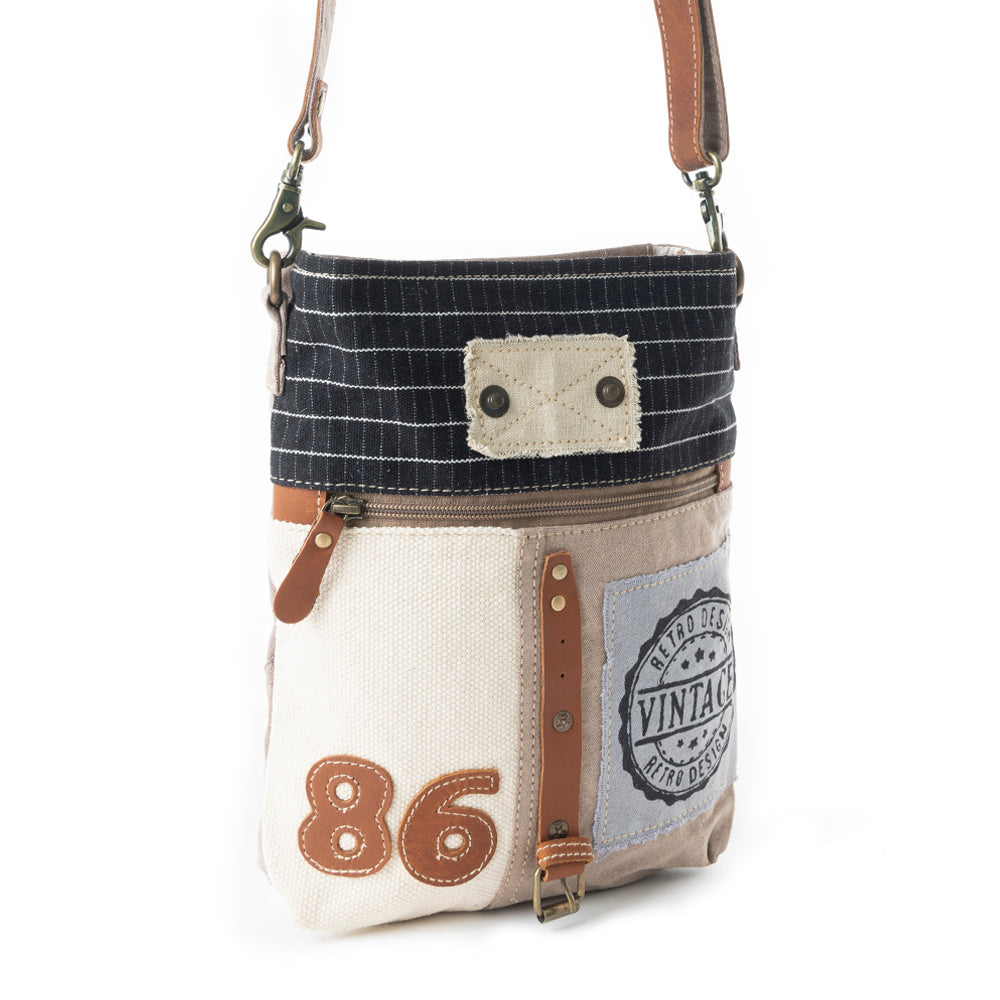 With the charm of vintage design front and center, this splendid bag features a richly textured design with sewn numbers, a worded patch, and leather accents. Zipper-close top, canvas back with zippered pocket, and rich chocolate leather adjustable, removable shoulder strap. With a fun and light-hearted feel, it’s a unique bag that be an eye-catching addition to any wardrobe.