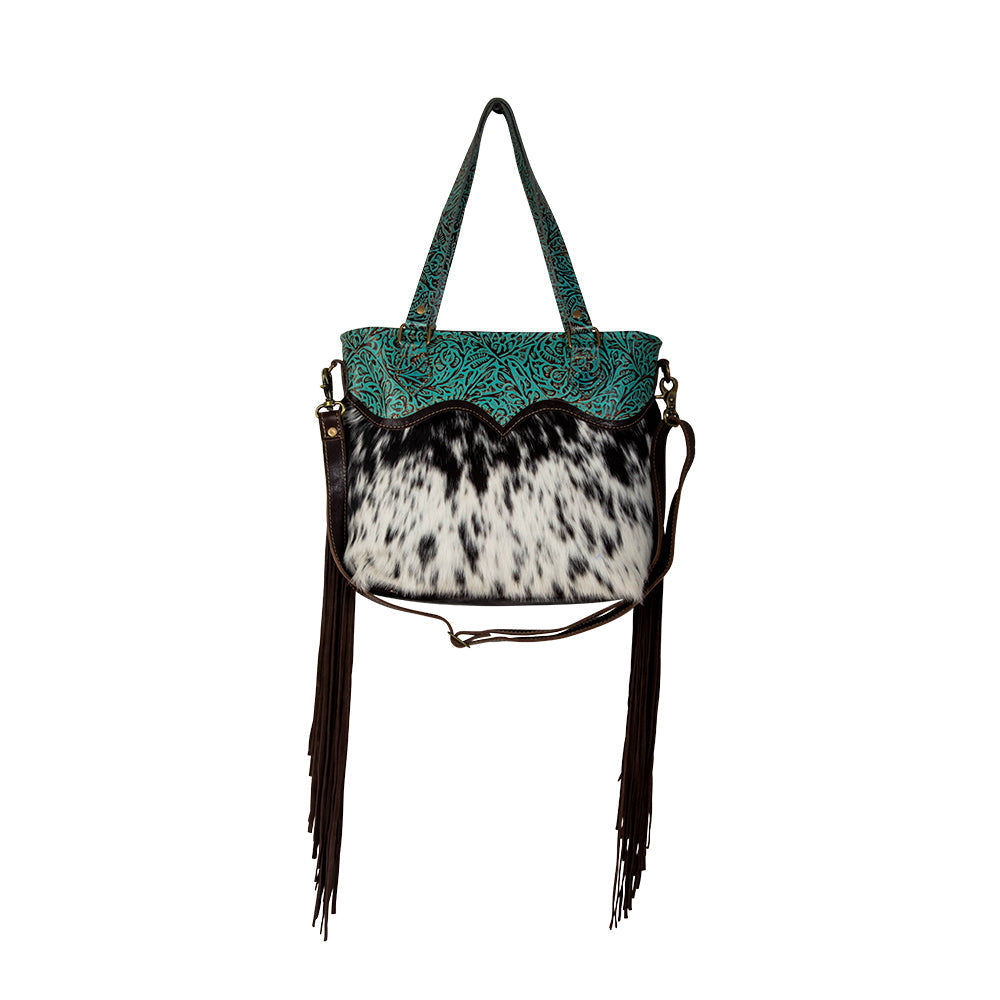With its graceful hand-tooled flap and gorgeous hair-on hide, this fringed bag makes a stunning statement. Leather fringe on each side is just the right length. The spacious interior features a zipper close top, and the carrying straps are also hand-tooled to match. Back is gorgeous dark chocolate leather with separate zippered pocket. A beautiful bag in all respects!