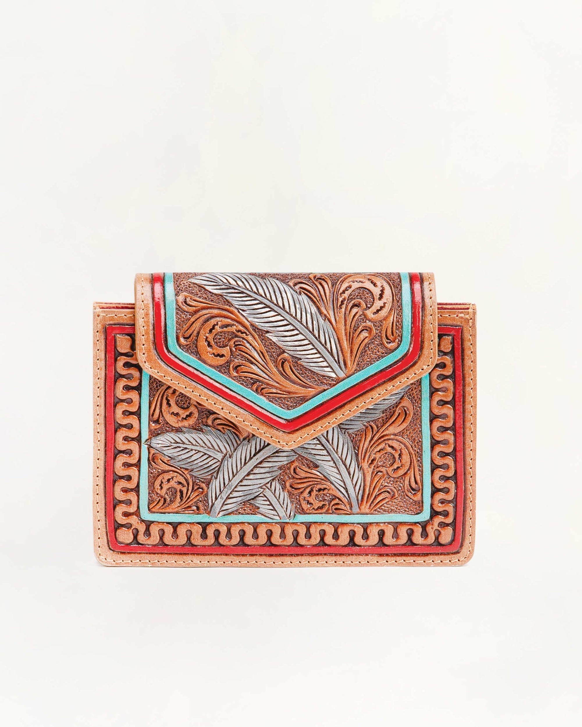 The Desert Sage Cardholder is a perfect blend of style and functionality. Crafted from premium calfskin, it features intricate hand-tooling with a vibrant, colorful design that showcases expert craftsmanship. A small flap adds a practical touch, securing your essentials with ease.