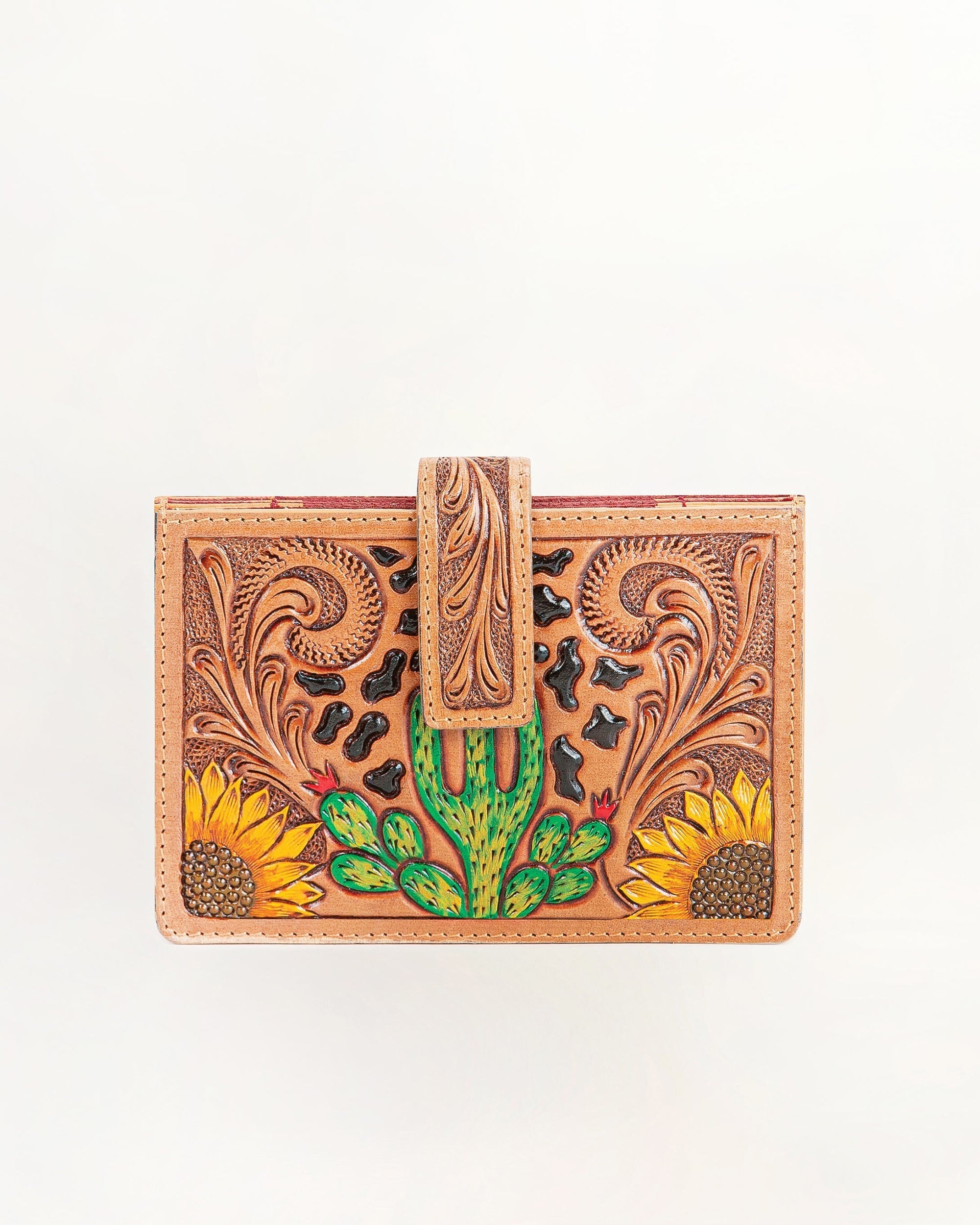 The Prairie Sunshine Cardholder radiates with the beauty of the desert's first light, featuring a majestic sunflower surrounded by intricate scrollwork that pays tribute to traditional Western patterns. Crafted from premium calfskin, this handtooled leather cardholder is as functional as it is beautiful, with multiple slots and compartments for your ID, cards, and cash. Its vibrant design and Western artistry make it a delightful accessory that adds a touch of warmth and elegance to your everyday essentials.