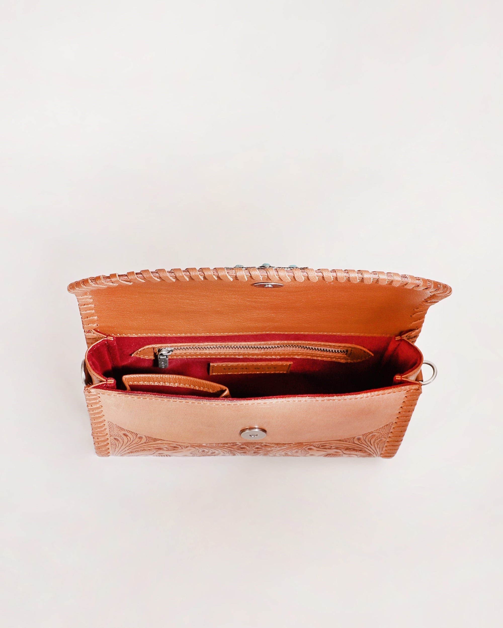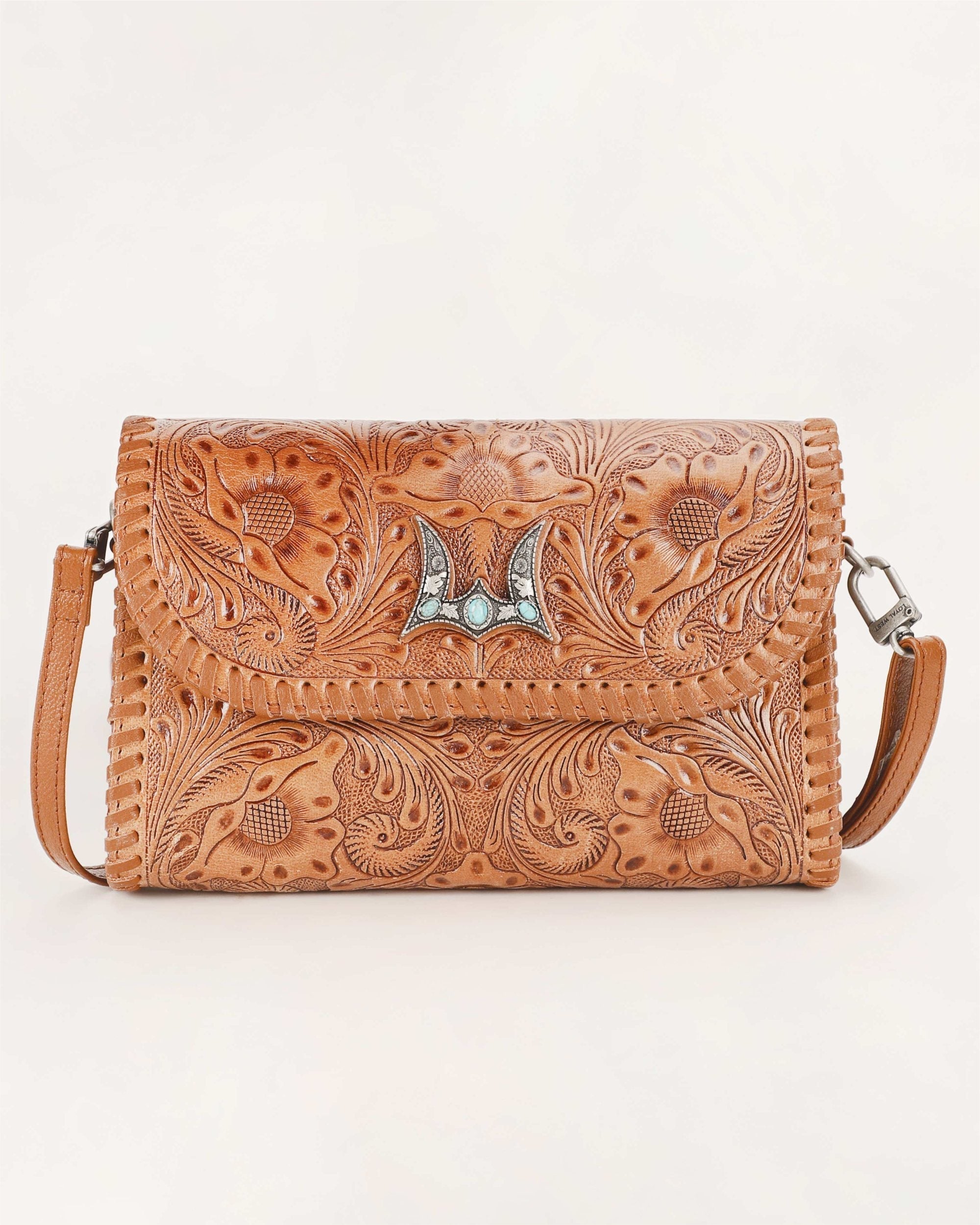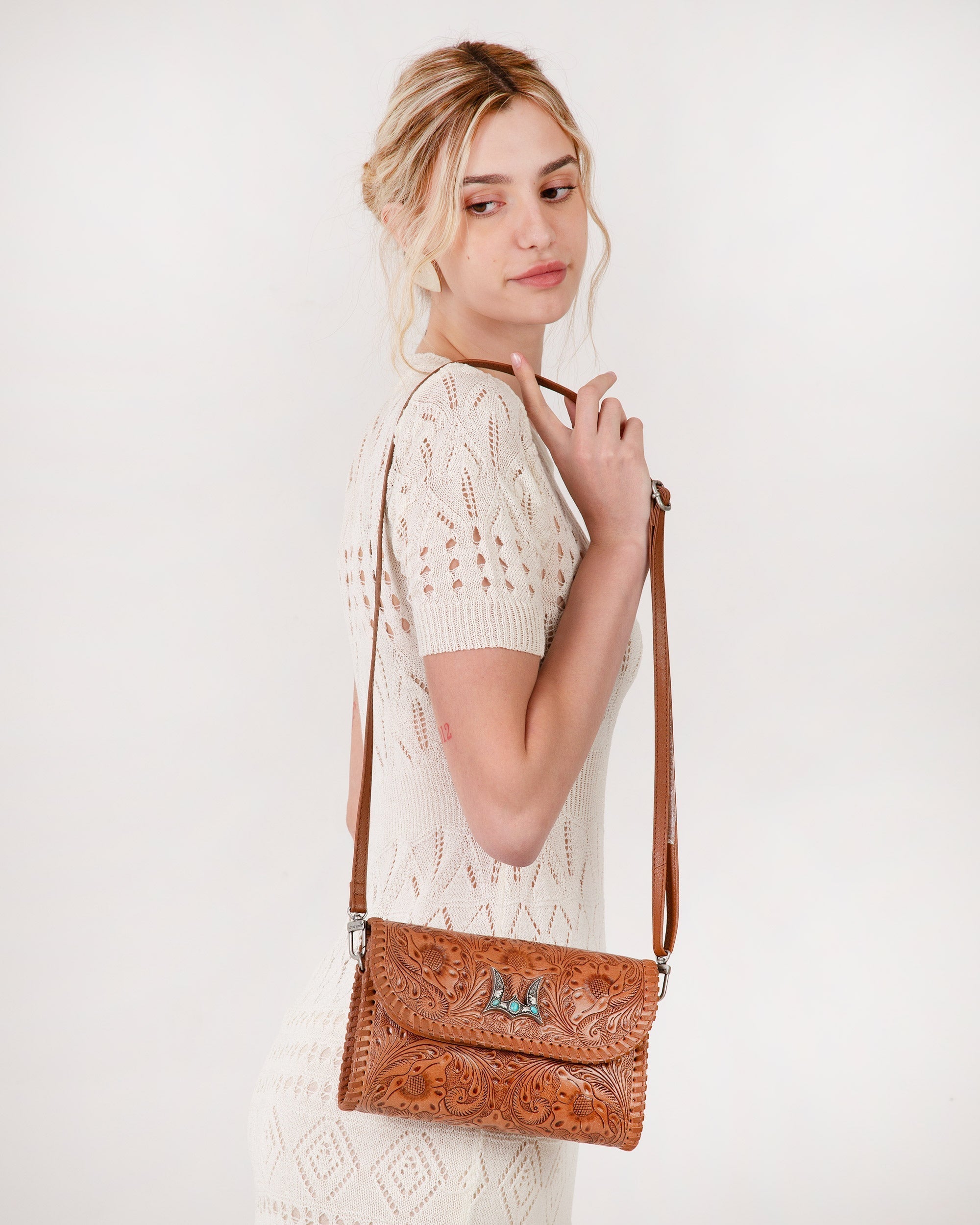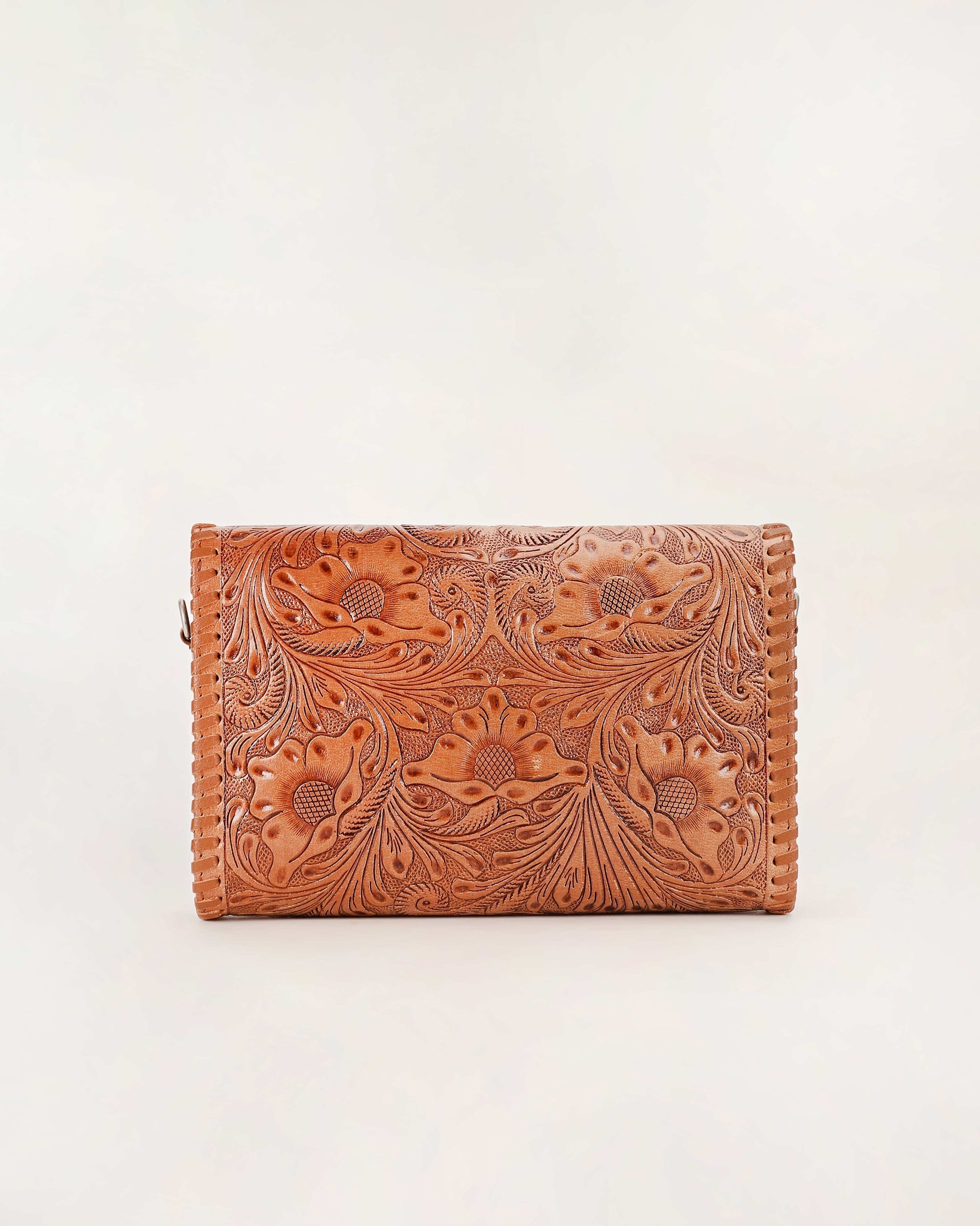 The Novina Mini Purse is a beautifully crafted crossbody bag made from full handtooled leather and soft calfskin in a rich brown hue. The intricate handtooling covers the entire bag, giving it a unique, artisanal touch that exudes craftsmanship and style.