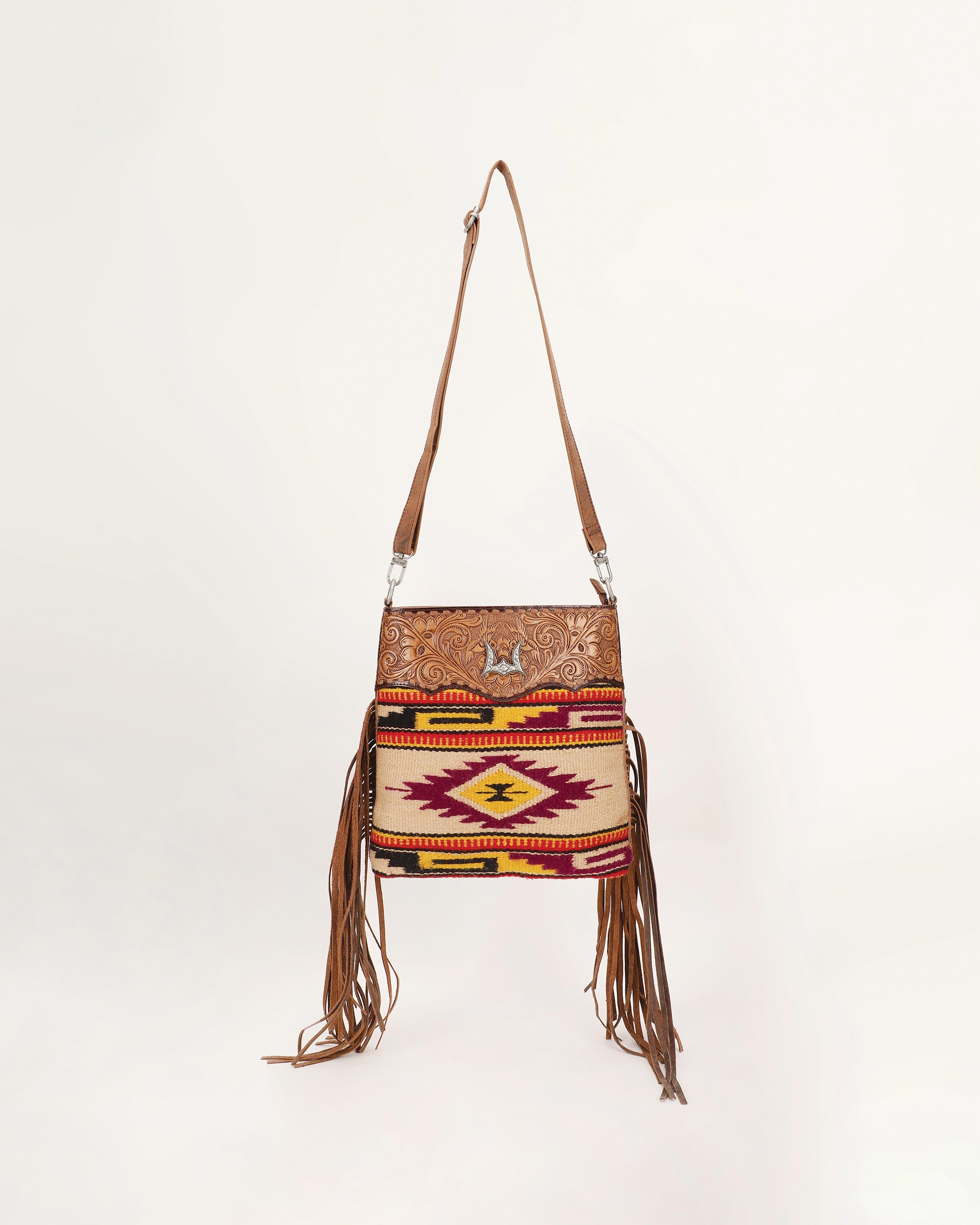 The Gloriana Medium Bag in vibrant turquoise is a statement shoulder bag crafted from soft wool and smooth calfskin. The hand-tooled leather accents add an artisanal touch, showcasing exquisite craftsmanship and a unique design.