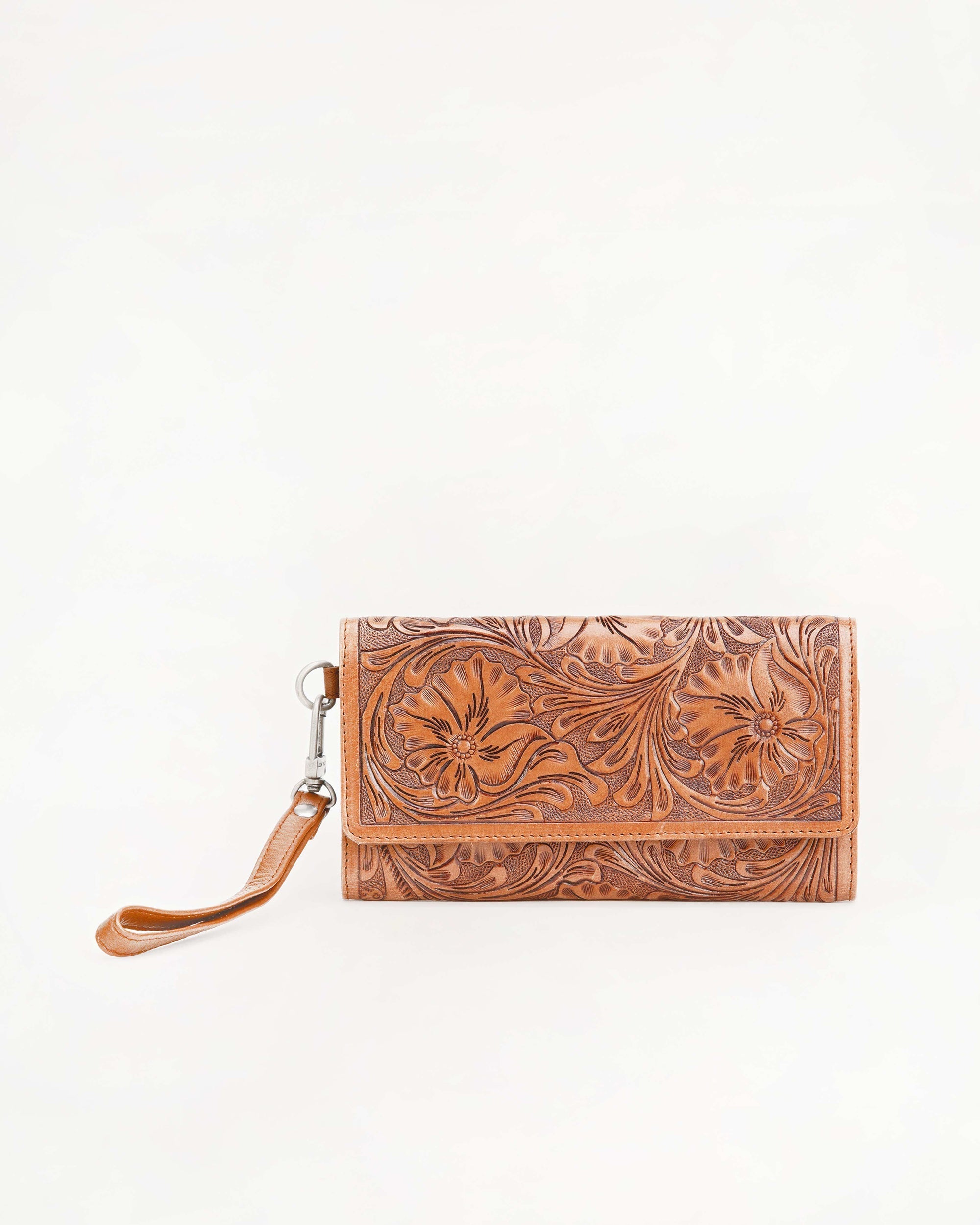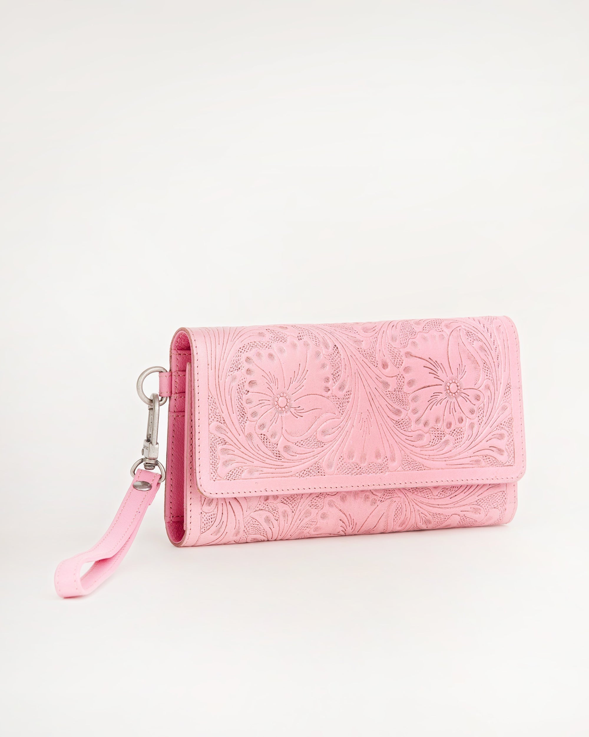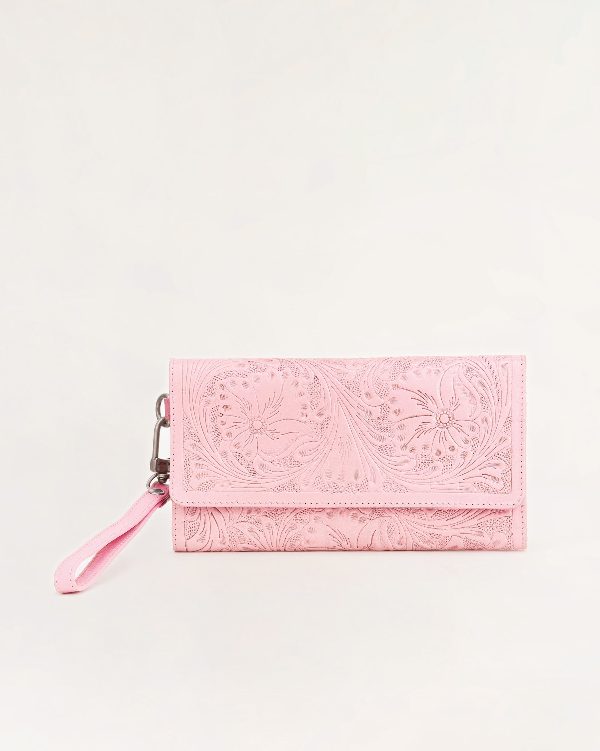 The Drover Wallet in pink handtooled leather and calfskin is a perfect blend of artistry and functionality. Crafted from premium handtooled calfskin, this wallet features intricate detailing that adds a touch of sophistication.