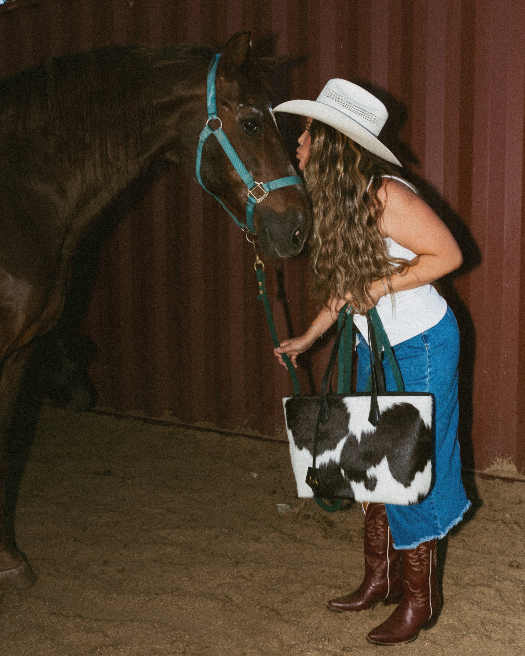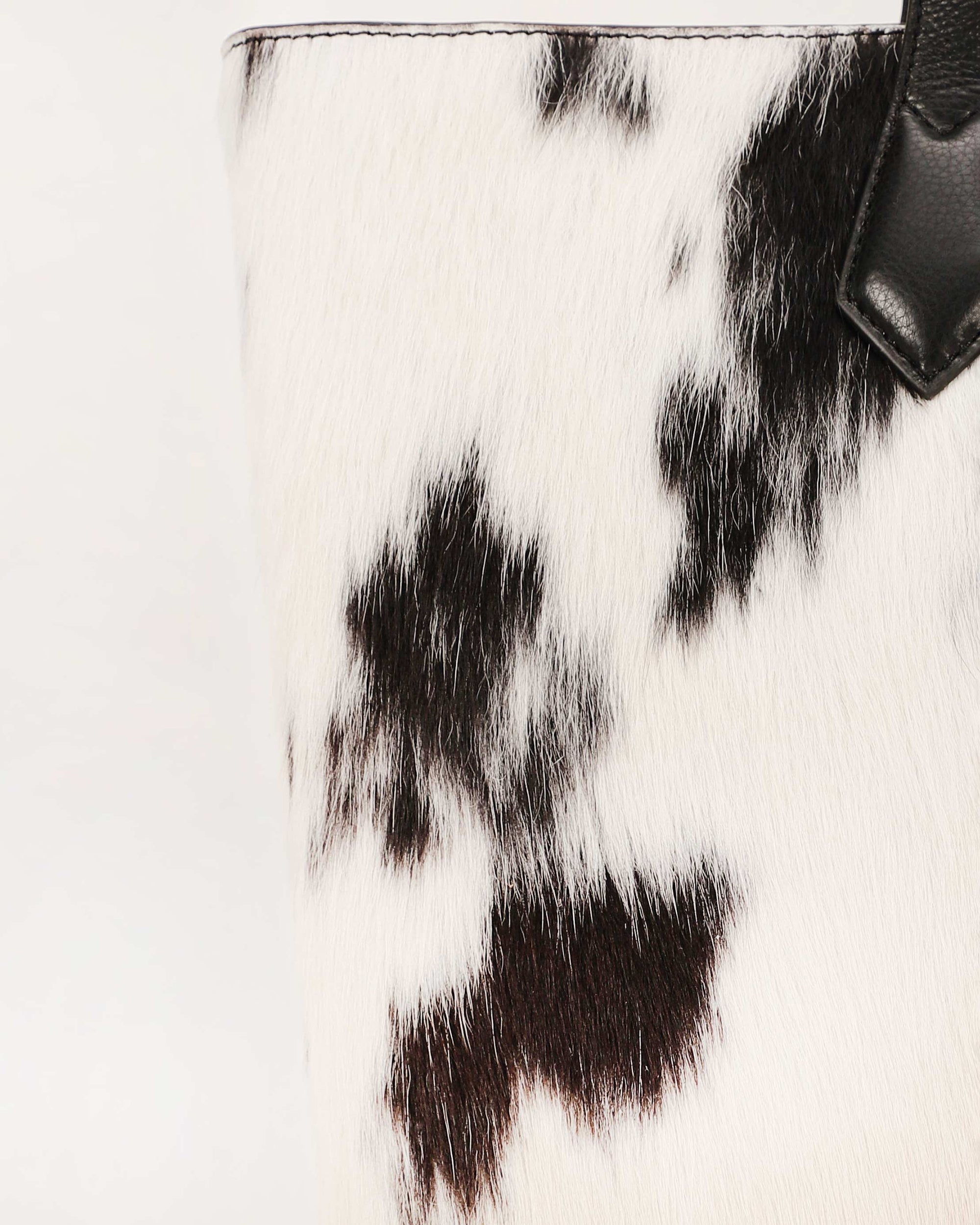 The contrast of black and white creates a timeless, eye-catching look, while the premium hairon cowhide ensures durability and a sophisticated finish. Whether you're heading to work or out for the day, this tote adds an element of bold elegance to any outfit.