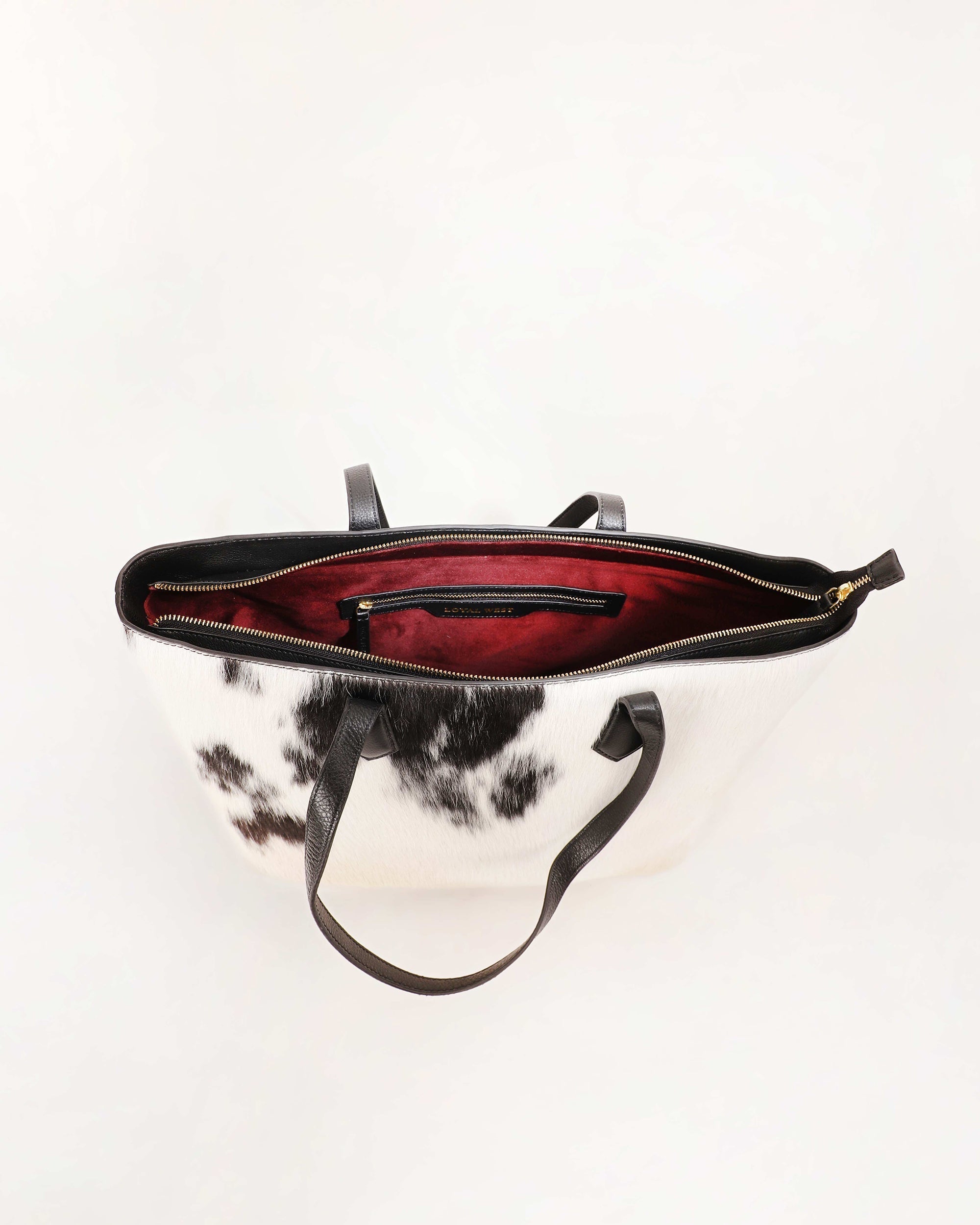 The California Poppy Large Tote Bag in striking black and white hairon cowhide offers a bold and luxurious design. With its spacious interior and unique texture, this tote is perfect for both everyday use and stylish outings.