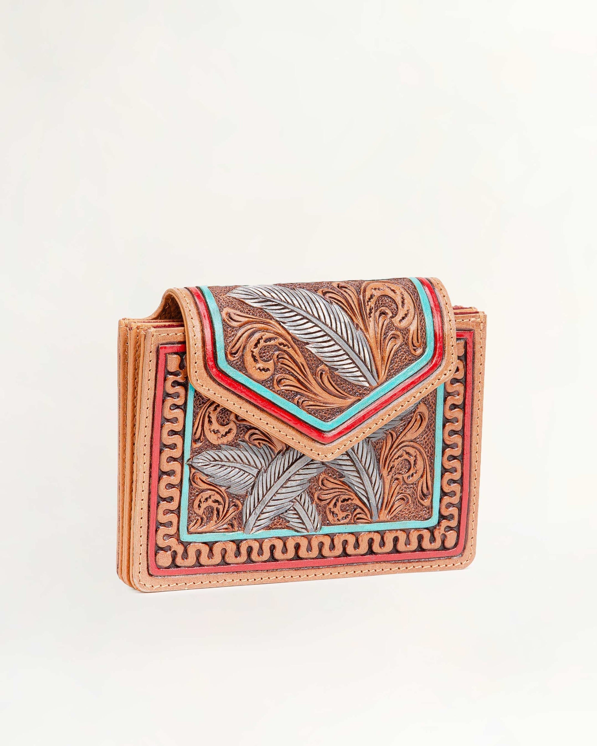 The Copper Canyon Cardholder is a striking blend of functionality and artistry. Crafted entirely with intricate hand-tooling on premium calfskin, it features a colorful design that highlights exceptional craftsmanship. A small flap adds an extra layer of practicality and security, keeping your cards safely in place.