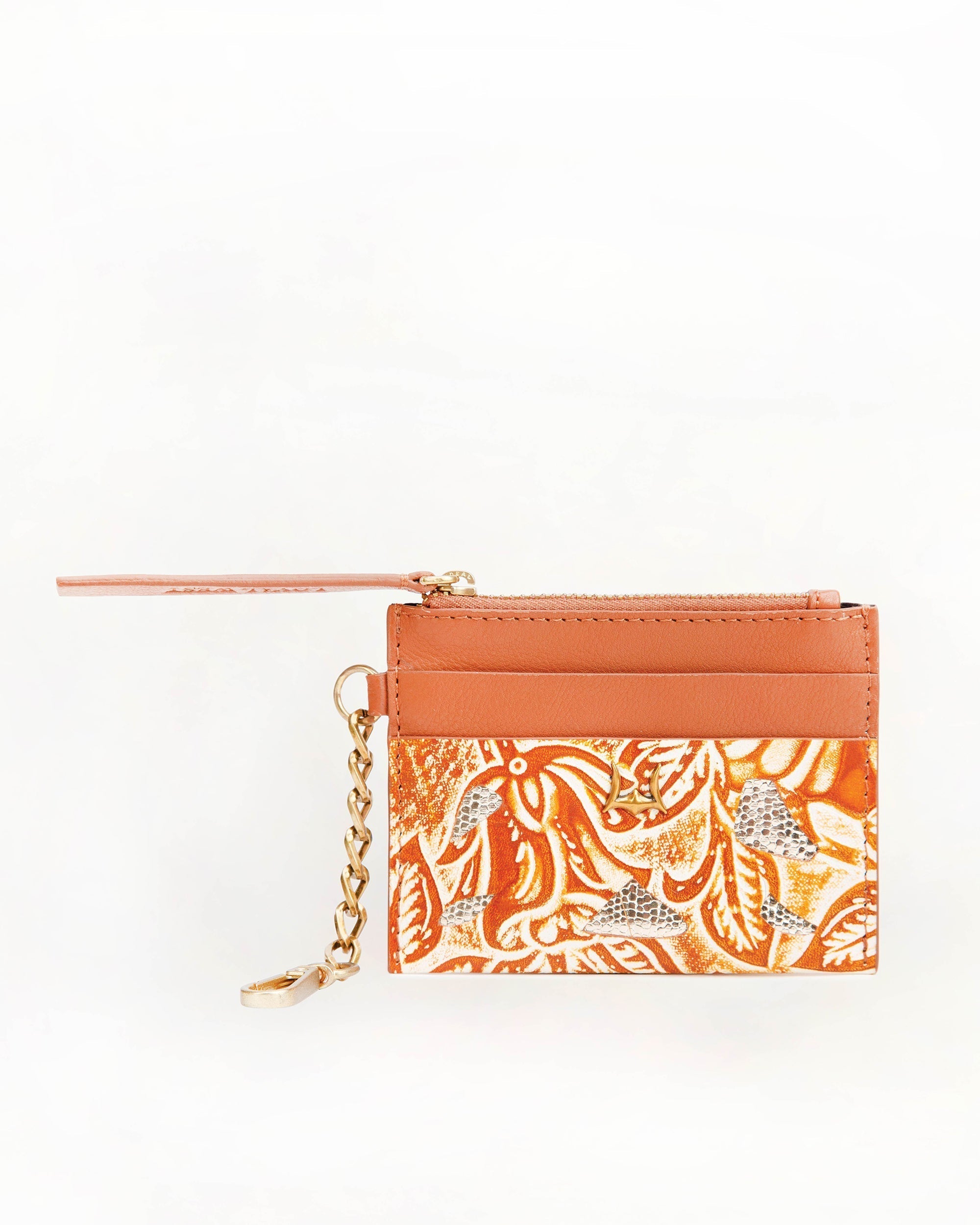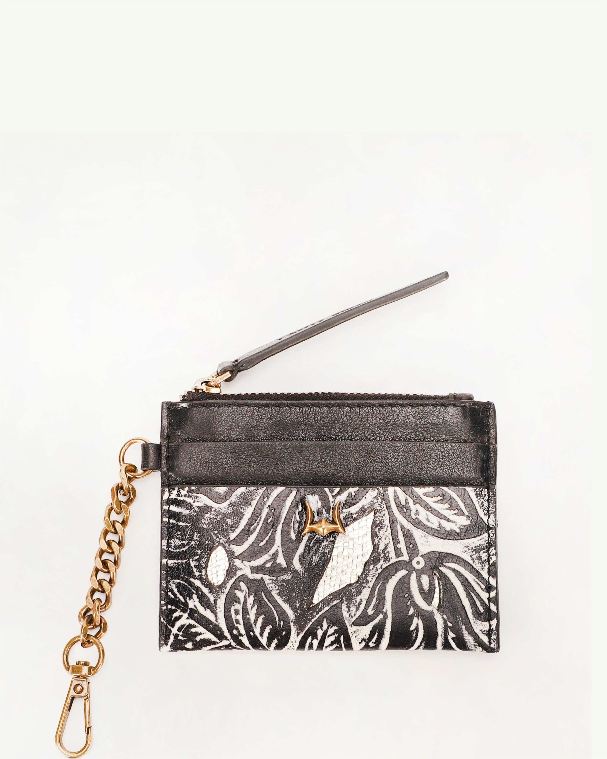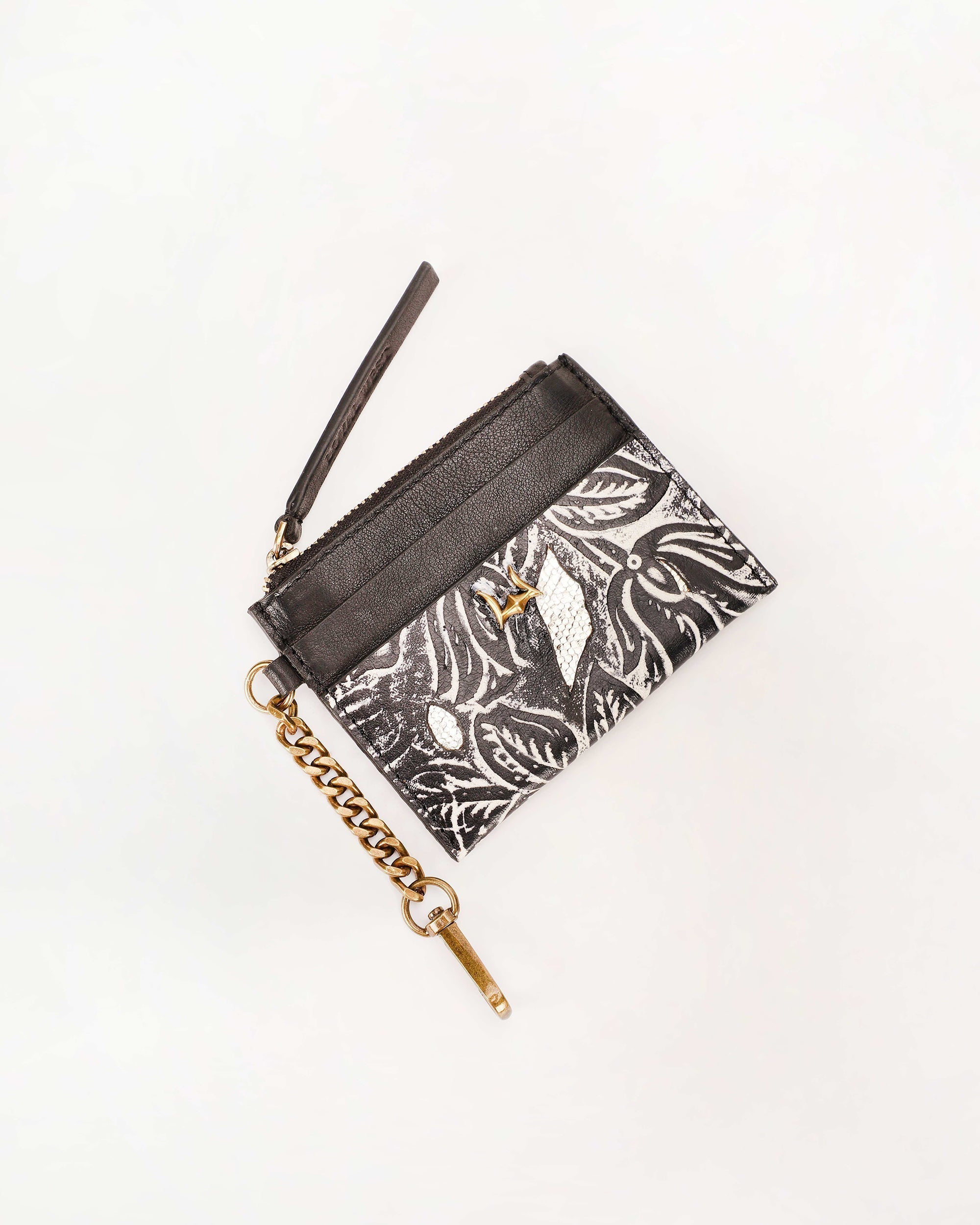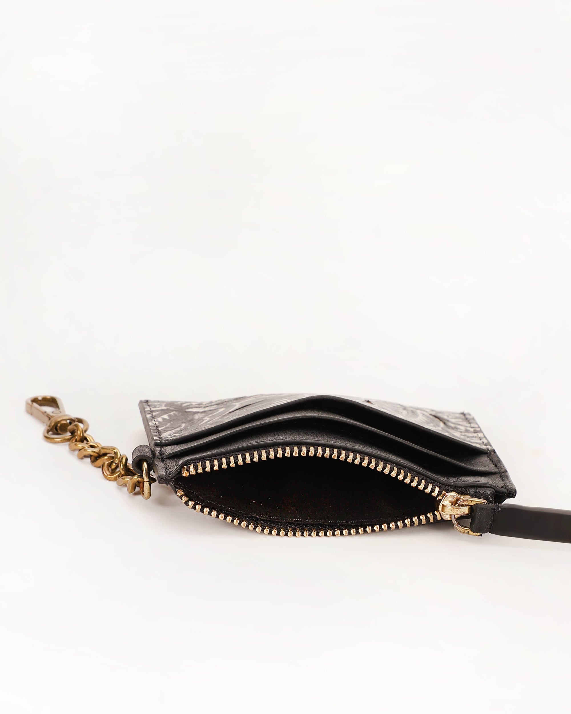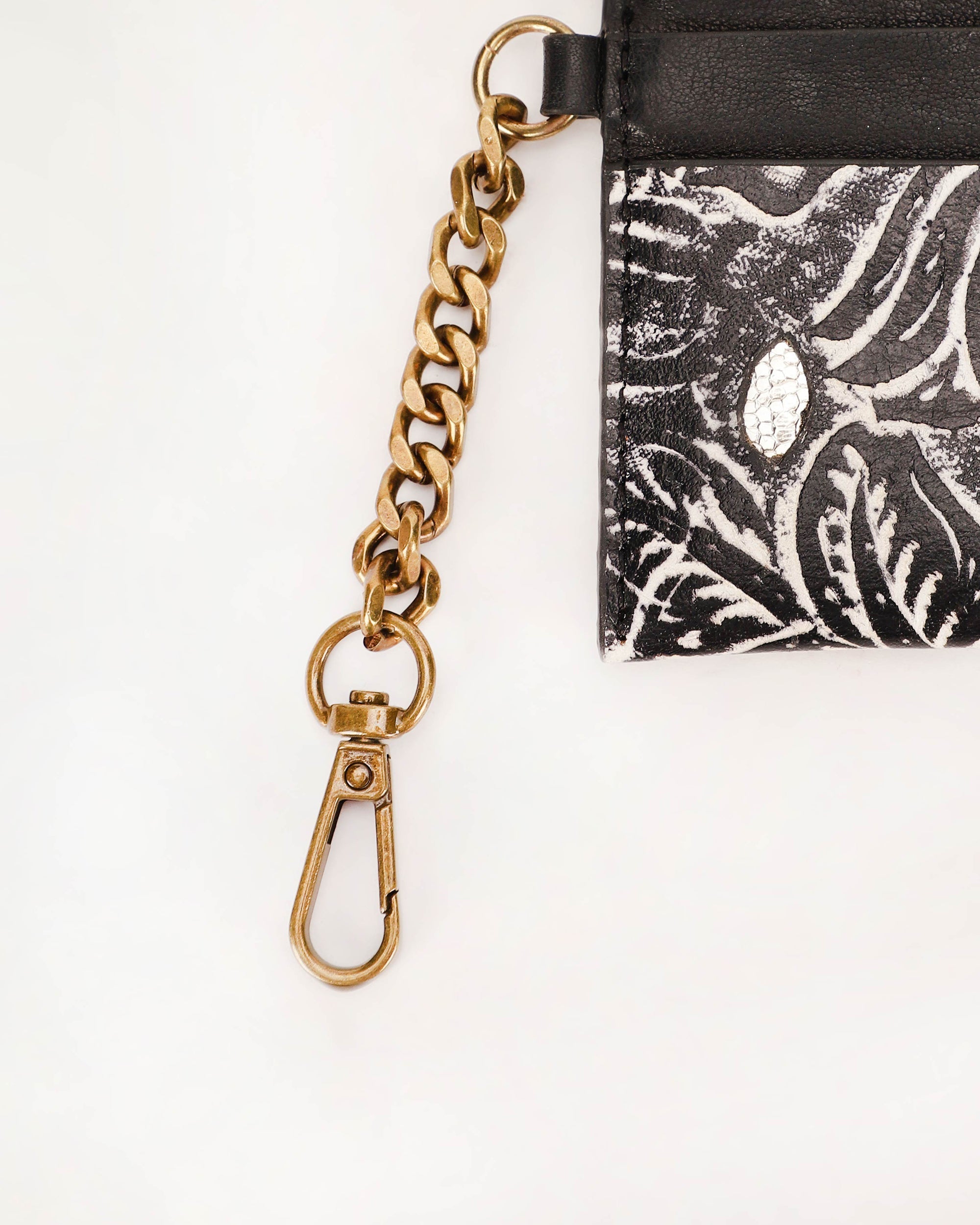The Shell Credit Card Holder exudes elegance and sophistication with its black floral leather adorned with golden foils. Accentuated by golden hardware, including a chain, logo, and dog hook, this stylish holder blends fashion with functionality. Its sleek design ensures your cards are neatly organized while adding a luxurious touch to your everyday essentials. Perfect for those who appreciate both intricate design and premium quality, this card holder is a standout accessory for any occasion